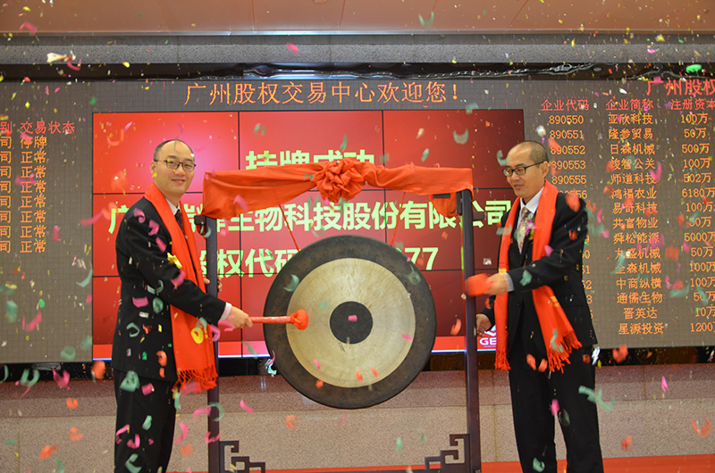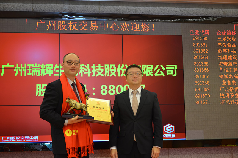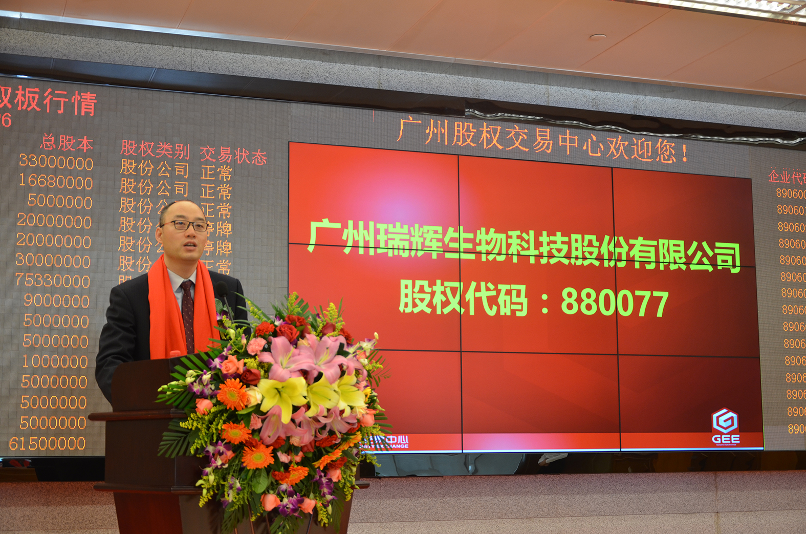 2016年12月30日,廣州瑞輝生物科技股份有限公司成功掛牌廣州市股權交易中心,本次掛牌廣交所的共有4家企業(yè),瑞輝生物是第一個發(fā)表講話和敲鐘的企業(yè)。