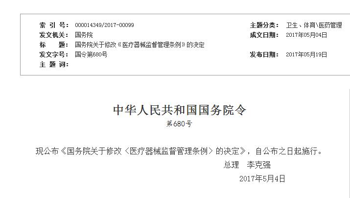 5月4日,國務(wù)院總理李克強(qiáng)簽署了國務(wù)院令第680號,公布了《國務(wù)院關(guān)于修改〈醫(yī)療器械監(jiān)督管理條例〉的決定》,自公布之日起施行。