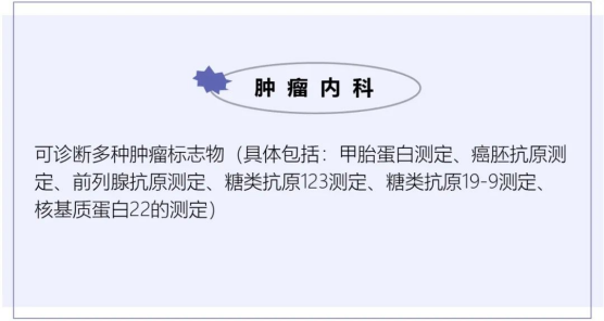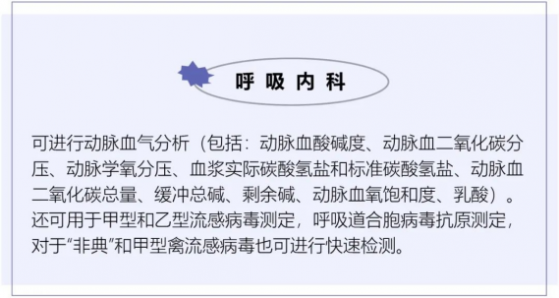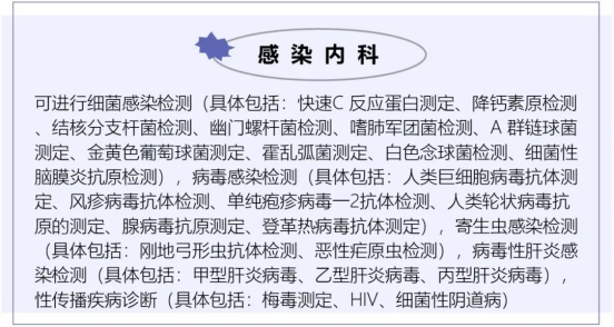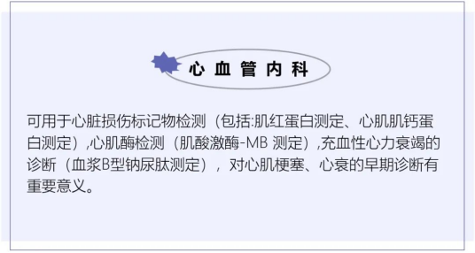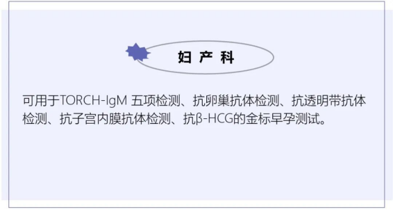 可用于心臟損傷標(biāo)記物檢測、動脈血?dú)夥治?、肝功能檢查、血紅蛋白定量、糖代謝紊亂、血脂代謝異常、血液電解質(zhì)、細(xì)菌感染檢測、病毒感染檢測、寄生蟲感染檢測、病毒性肝炎感染檢測、性傳播疾病診斷、多種腫瘤標(biāo)志物、TORCH-IgM 五項(xiàng)檢測、抗β-HCG的金標(biāo)早孕測試等。